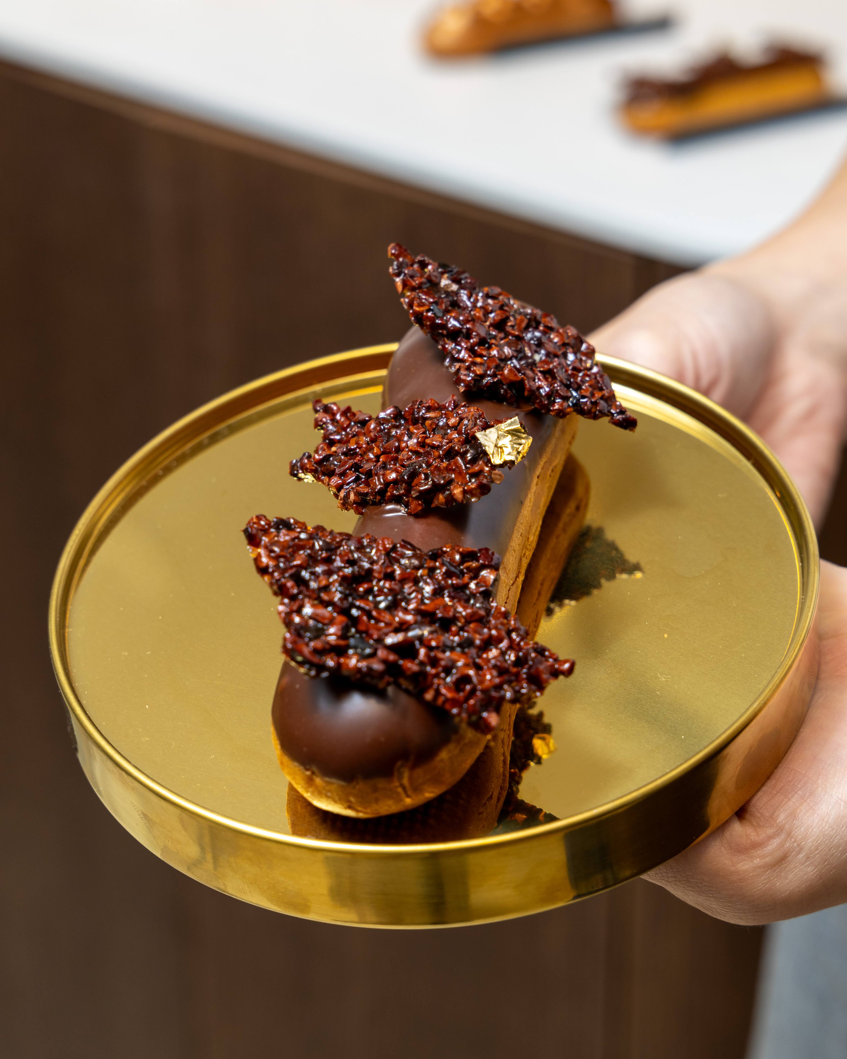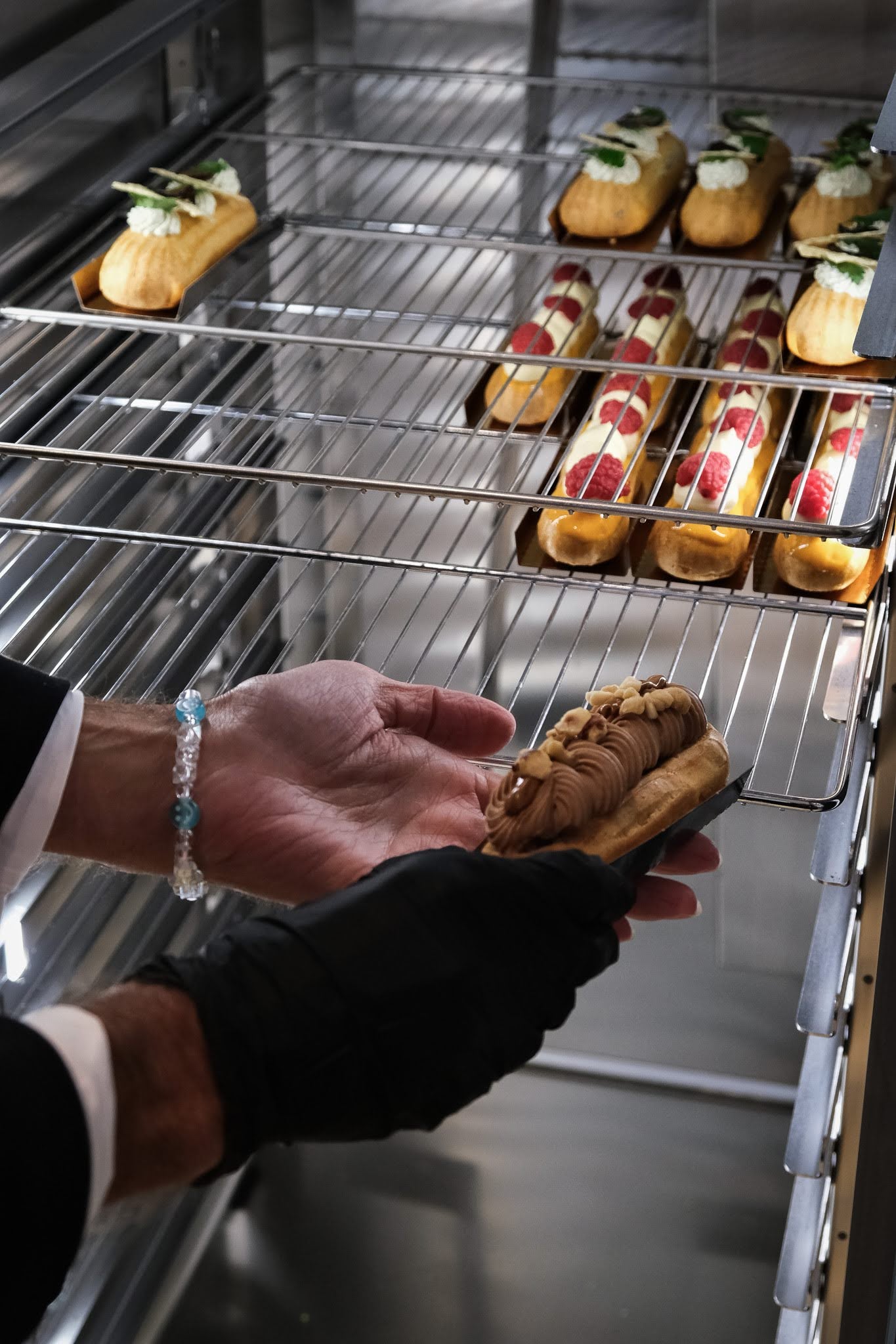 Il est 6h. L’atelier s’éveille, et les maîtres pâtissiers se mettent au travail. La pâte est préparée avec soin, puis pochée et cuite à la perfection. L’odeur du beurre chaud emplit l’air, tandis que les éclairs prennent forme. La crème, légère et onctueuse, est délicatement posée à l’intérieur, avant que chaque éclair ne soit glacé et décoré. Chaque geste est précis, chaque détail important, car ici, l’excellence se cache dans la perfection des petits gestes.