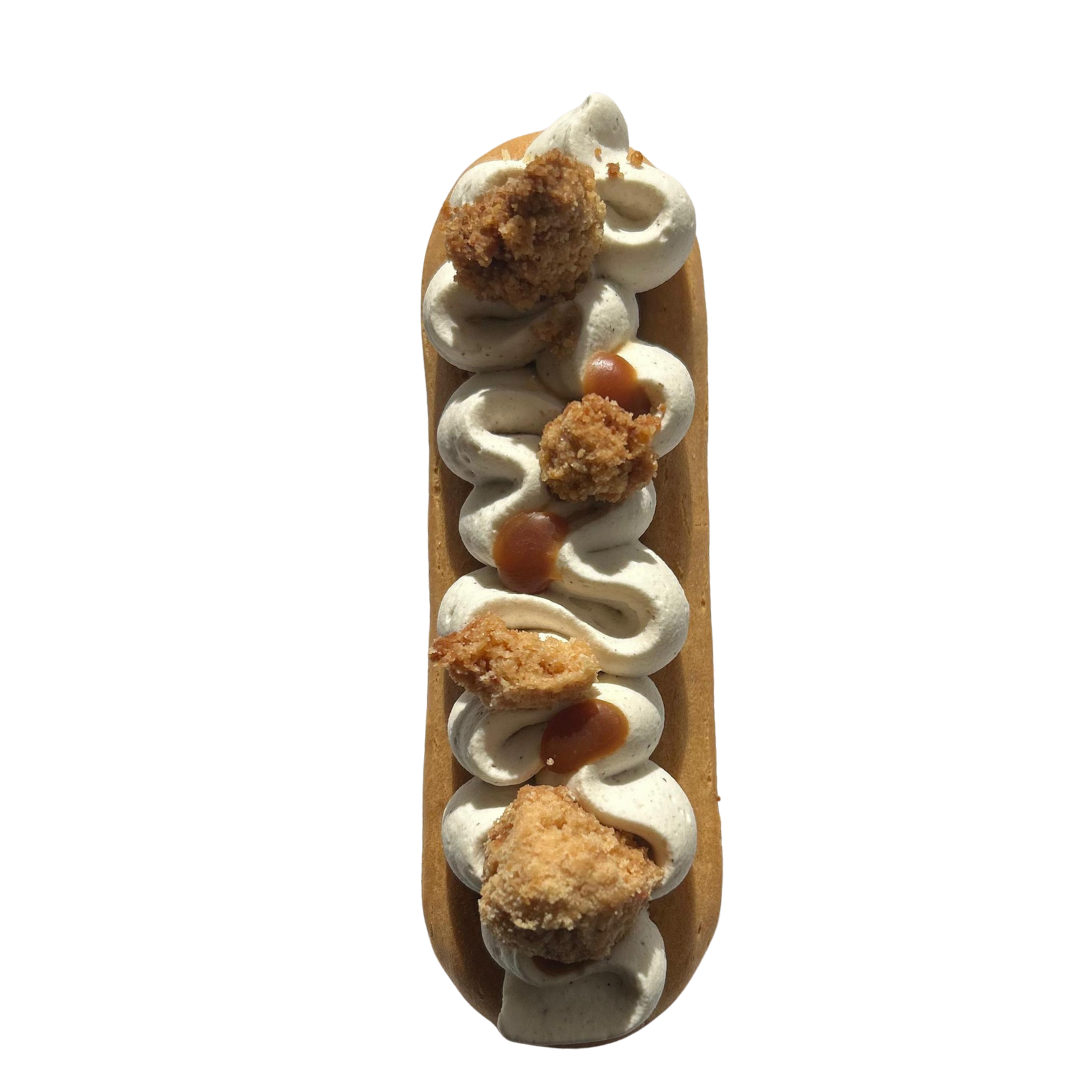 Retrouvez tout le charme de la tarte tatin dans un éclair raffiné. Sous son glaçage doré se cache un crémeux caramel onctueux, des pommes fondantes et délicatement caramélisées, une chantilly à la vanille aérienne et un streusel croustillant pour la touche finale.